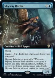 空道の盗人は「空道の盗人がプレイヤー1人に戦闘ダメージを与えるたび、あなたは空道の盗人によって追放されて いるカードのうちアーティファクトやインスタントやソー サリーである呪文1つをマナ・コストを支払うことなく唱えてもよい。」を持った状態で脱出する。