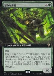 あなたの終了ステップの開始時に、あなたは 「あなたがコントロールしていてこれでないクリーチャー1体をオーナーの手札に戻し、そのクリーチャーのパワーに等しい数の+1/+1カウンターを緊急対応者の上に置く。」を選んでもよい。