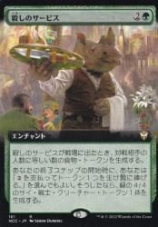 殺しのサービスが戦場に出たとき、対戦相手の人数に等しい人数の食物・トークンを生成する。(それらは、 「(2), (T), このアーティファクトを生け贄に捧げる:あなたは 3点のライフを得る。」を持つアーティファクトである。)