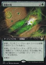 装備しているクリーチャーがプレイヤー1人に戦闘ダメージを与えるたび、その点数に等しい数の緑白の1/1の市民・クリーチャー・トー クンを生成する。