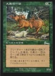 大鹿の一団がブロックされた状態になるたび、それはターン終了時まで、自身のブロックしているクリーチャー1体につき+2/+2の修整を受ける。