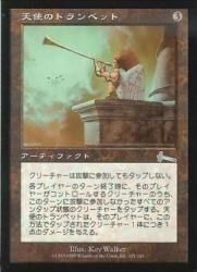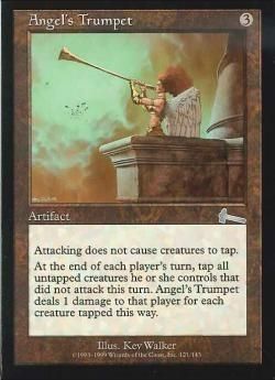 各プレイヤーの終了ステップの開始時に、そのプレイヤーがコントロールする、このターン攻撃しなかったすべてのアンタップ状態のクリーチャーをタップする。天使のトランペットはそのプレイヤーに、これによりタップされたクリーチャー1体につき1点のダメージを与える。
