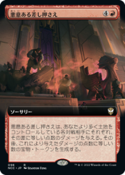 悪意ある差し押さえは、あなたより多く土地をコントロールしている各対戦相手にそれぞれ、その差に等しい点数のダメージを与える。その後、これにより与えたダメージの点数に等しい数の宝物・トークンを生成する。