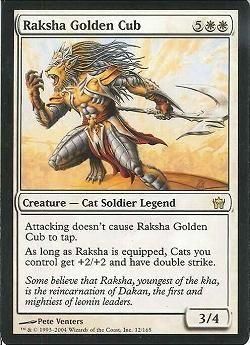 警戒 黄金の若人ラクシャが装備している限り、あなたがコントロールする猫(Cat)は+2/+2の修整を受けるとともに二段攻撃を持つ。
