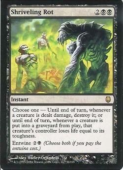 以下の2つから1つを選ぶ。「ターン終了時まで、クリーチャーがダメージを与えられるたび、それを破壊する。」「ターン終了時まで、いずれかのクリーチャーが死亡するたび、そのクリーチャーのコントローラーはそのクリーチャーのタフネスに等しい点数のライフを失う。」