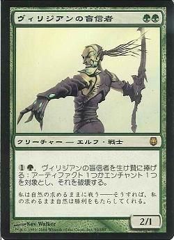 (1)(緑),ヴィリジアンの盲信者を生け贄に捧げる:アーティファクト1つかエンチャント1つを対象とし、それを破壊する。