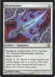 装備しているクリーチャーは+2/+1の修整を受けるとともに「(T),心臓追いの短剣をはずす:クリーチャー1体を対象とし、それを破壊する。」を持つ。