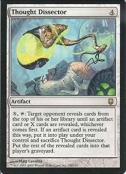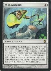 (X),(T):対戦相手1人を対象とする。そのプレイヤーは自分のライブラリーを、アーティファクト・カードが公開されるか、カードがX枚公開されるまで上から1枚ずつ公開する。これによりアーティファクト・カードが公開された場合、それをあなたのコントロール下で戦場に出し、思考の解剖器を生け贄に捧げる。これにより公開された残りのすべてのカードを、そのプレイヤーの墓地に置く。
